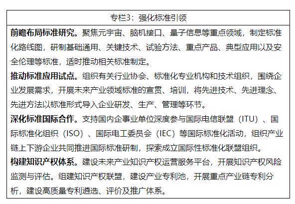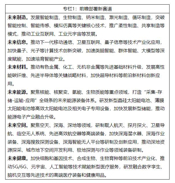 1.加强前瞻谋划部署。把握全球科技创新和产业发展趋势,重点推进未来制造、未来信息、未来材料、未来能源、未来空间和未来健康六大方向产业发展。打造未来产业瞭望站,利用人工智能、先进计算等技术精准识别和培育高潜能未来产业。发挥新型举国体制优势,引导地方结合产业基础和资源禀赋,合理规划、精准培育和错位发展未来产业。发挥前沿技术增量器作用,瞄准高端、智能和绿色等方向,加快传统产业转型升级,为建设现代化产业体系提供新动力。