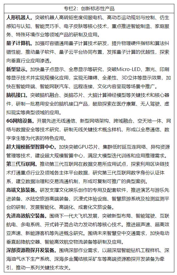 6.做强未来高端装备。面向国家重大战略需求和人民美好生活需要,加快实施重大技术装备攻关工程,突破人形机器人、量子计算机、超高速列车、下一代大飞机、绿色智能船舶、无人船艇等高端装备产品,以整机带动新技术产业化落地,打造全球领先的高端装备体系。深入实施产业基础再造工程,配资炒股补齐基础元器件、基础零部件、基础材料、基础工艺和基础软件等短板,夯实未来产业发展根基。
