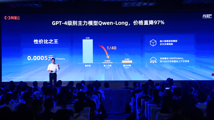 5月21日,阿里云抛出重磅炸弹:通义千问GPT-4级主力模型Qwen-Long,API输入价格从0.02元/千tokens降至0.0005元/千tokens,直降97%。这意味着,1块钱可以买200万tokens,相当于5本《新华字典》的文字量。这款模型最高支持1千万tokens长文本输入,降价后约为GPT-4价格的1/400,击穿全球底价。