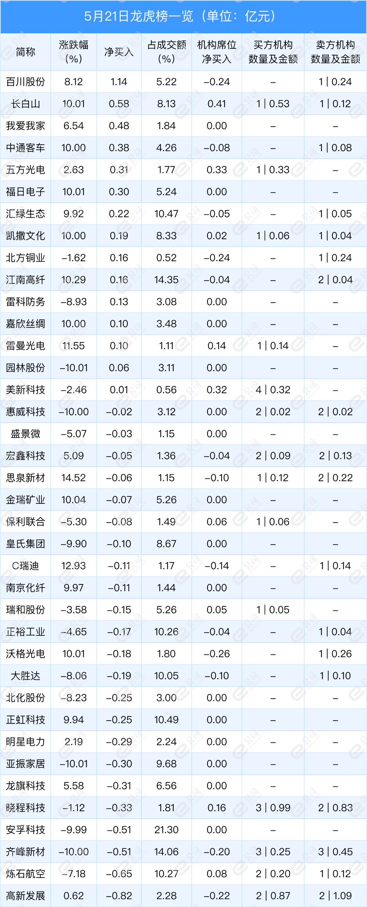 5月21日龙虎榜中机构及营业部席位资金净卖出1.26亿元,其中净买入的个股有15只;净卖出的个股有23只。净买入金额居前的个股分别是百川股份、长白山、我爱我家等,在线配资知识净买入金额占当日成交额比例达5.22%、8.13%、1.84%。
